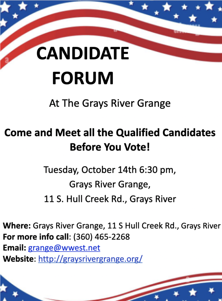 When: Tuesday, October 14th at 6:30 PM Where: Grays River Grange, 11 S Hull Creek Rd., Grays River, WA. For more info call: (360) 465-2268 or email us at grange@wwest.net
