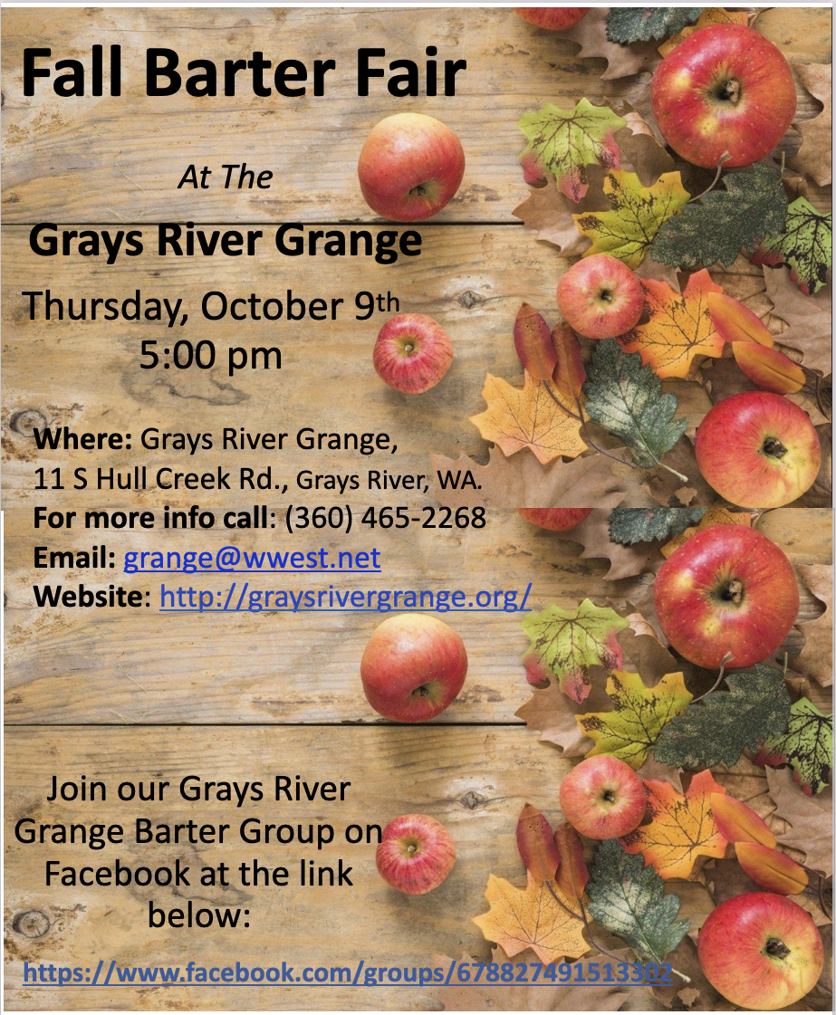 When: Thursday, October 9th at 5:00 PM Where: Grays River Grange, 11 S Hull Creek Rd., Grays River, WA. For more info call: (360) 465-2268 or email us at grange@wwest.net