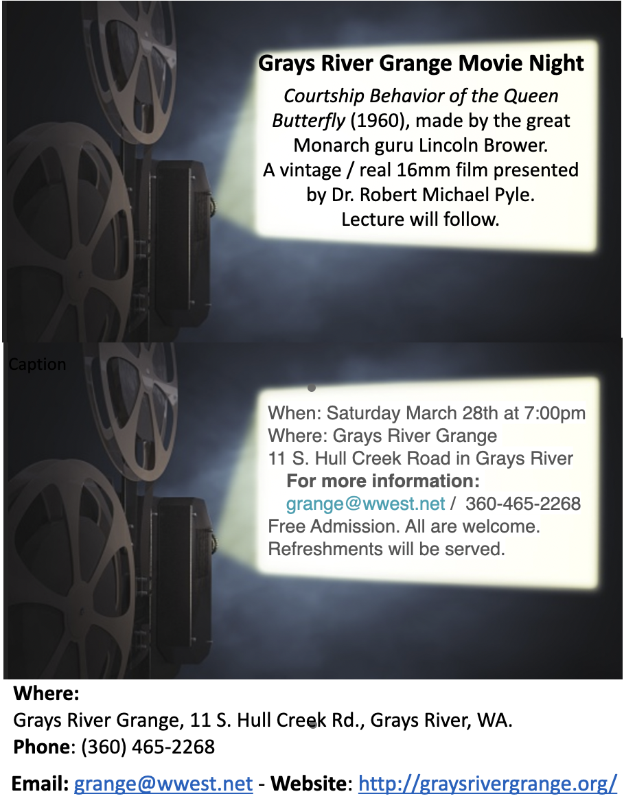 “The Dark Divide” is an amazing film based on Robert Michael Pyle’s book “Where Bigfoot Walks, Crossing the Dark Divide”. This is your chance to view this film on the big screen, in community, at The Grays River Grange.